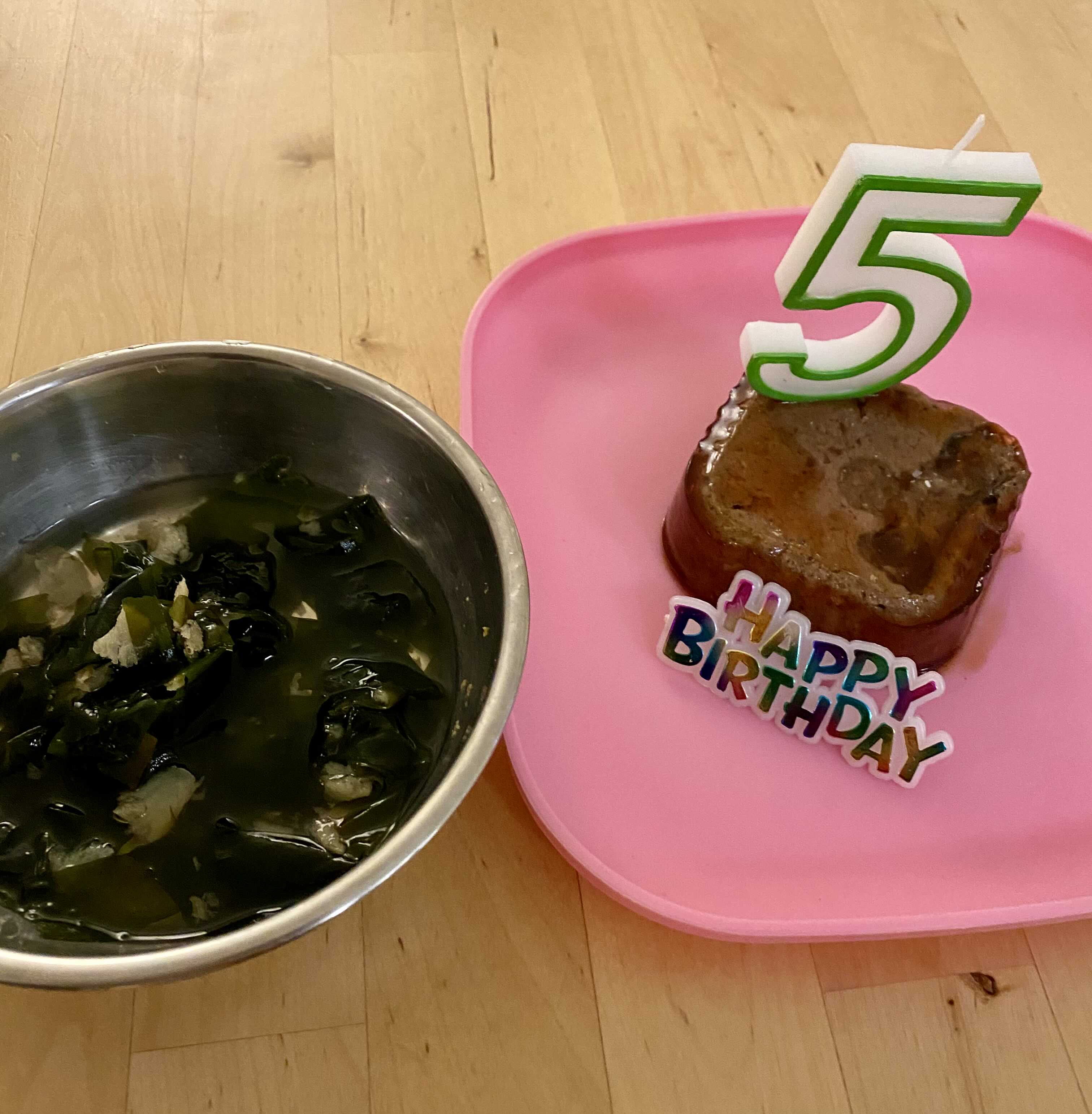 생일 장식 놓고 5살 초를 올려 주었어요. 황태 미역국은 평소 먹는 밥그릇에 삼분의 일 정도 양이에요~